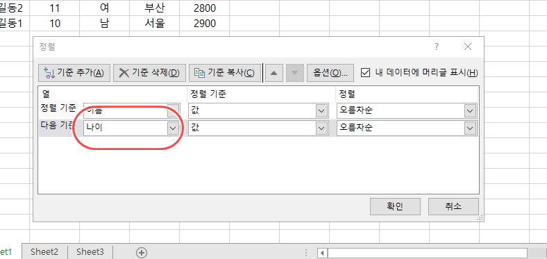 엑셀 데이터 정렬 중 데이터 기준이 여러 개인 경우 정렬 방법