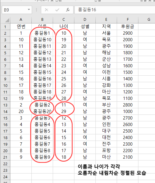 그리고 나이의 정렬 역시 홍길동1부터 홍길동 19에 해당되는 나이가 내림차순 정렬이 되고, 이후 홍길동2부터 홍길동 20의 나이가 정렬되며, 홍길동3부터 홍길동9까지의 나이가 내림차순 정렬되는 것을 알 수 있다.