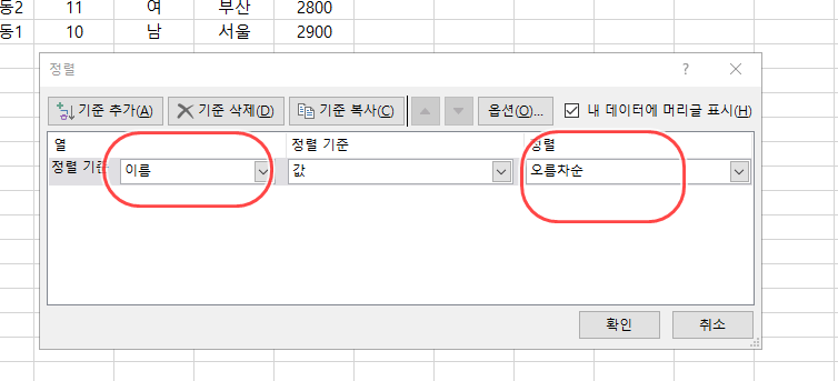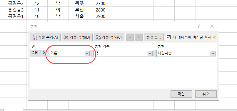 처음에 정렬의 방식이 "이름"을 "오름차순 정렬"로 하고, "나이"는 "내림차순 정렬"을 하기로 했으니 먼저 "이름"을 "오름차순 정렬"하도록 지정해 보겠다.